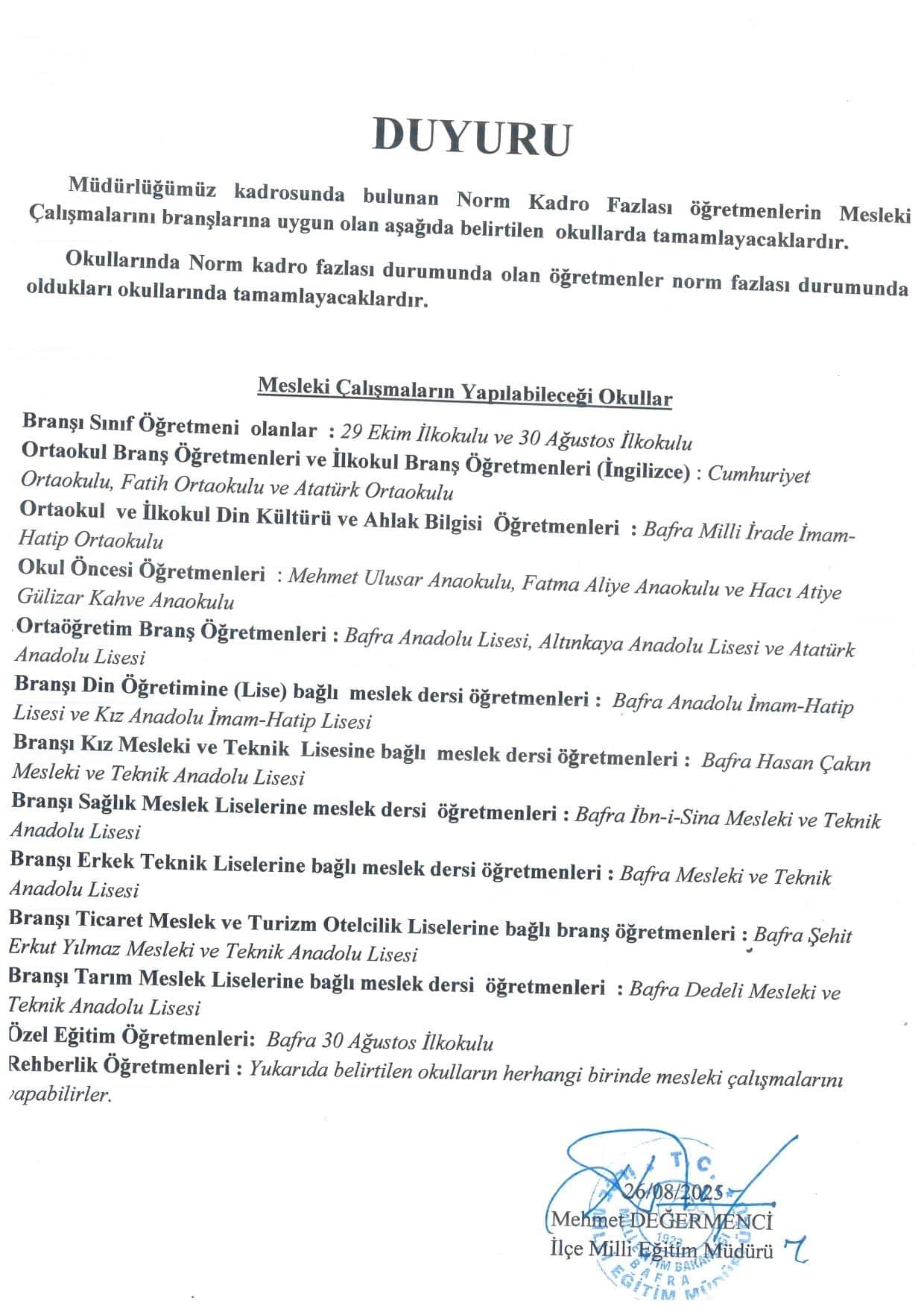 İlçemizde norm kadro fazlası öğretmenlerimizin 2025-2026 eğitim yılı sene başı mesleki çalışmalarını yapacakları okullar belirlenmiştir.